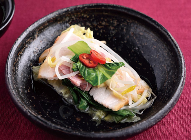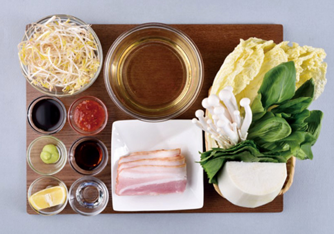 알배추 8장(200g), 깻잎 12장(20g), 베이컨 80g, 무 100g, 숙주 120g, 청경재 80g, 백일송이 25g