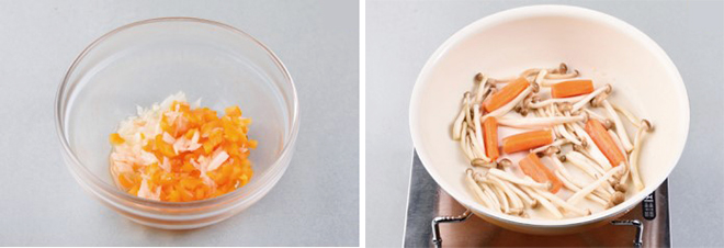 ④ 당근은 먹기 좋은 크기로 잘라 버터에 살짝 볶아주다 백일송이 버섯도 함께 볶는다.