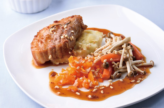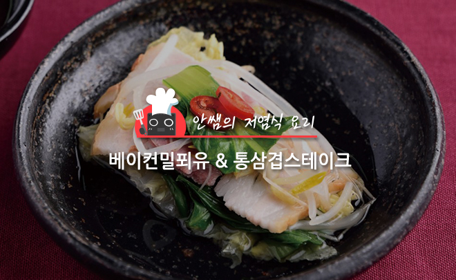 오늘 소개할 요리는 베이컨밀푀유와 통삼겹스테이크입니다. 베이컨밀푀유는 나트륨 함량이 다른 식재료보다 더 높은 베이컨은 한 번 데쳐 조리하였습니다. 통삼겹스테이크는 된장소스에 플레인 요구르트를 사용해 나트륨을 줄였고, 볶은 현미를 이용해 부고소한 맛으로 내주었습니다.