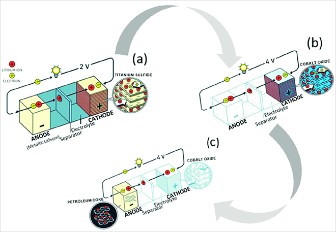 리튬이온전지는 1970년대에 처음 등장했습니다. 당시 석유회사인 엑슨모빌에서 일하던 마이클 스탠리 위팅엄(Michael Stanley Whittingham) 영국 빙엄턴대학교 교수가 이황화티탄(TiS2)을 양극으로, 금속 리튬을 음극으로 사용한 리튬이온전지를 개발했지요. 기존의 다른 2차 전지보다 크기는 작으면서 더 많은 에너지를 저장할 수 있어 획기적이었습니다. 하지만 이 리튬이온전지는 전압이 낮다는 단점이 있었습니다. 존 배니스터 굿이너프(John Bannister Goodenough) 미국 텍사스대학교 교수는 양극의 재료를 리튬 코발트 산화물로 바꾸어 전압을 높이는 데 성공했지요.