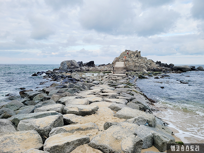 해변가에서 오작교를 지나 징검다리를 건너 작은 바위섬 정상에 오르면, 광활한 바다위에 떠 있는 듯 상상에 빠진다. 해변에서 이어진 바위섬이 뜬금없지만 바위섬의 매력은 보는 이의 마음을 흔든다.