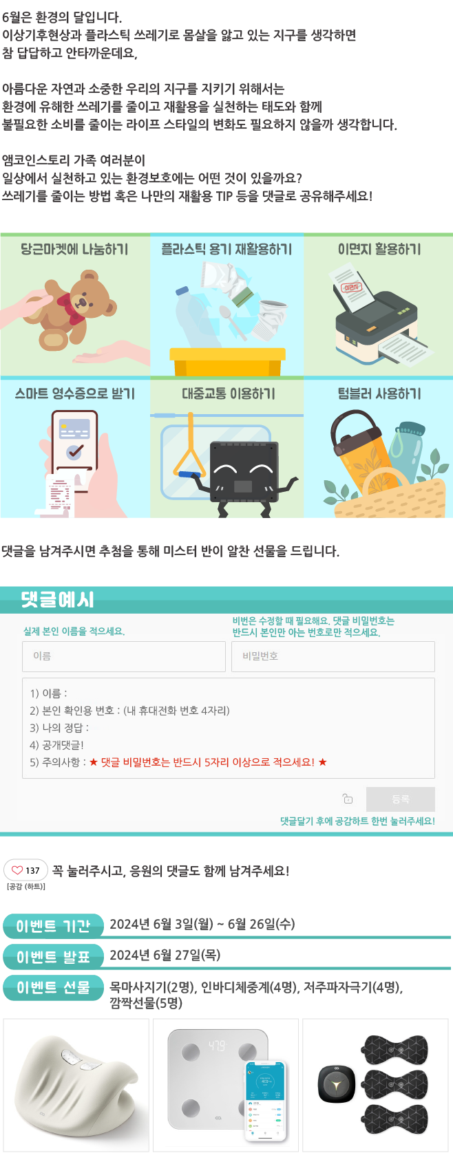 | 환경의 달! 지구 지키기 이벤트 결과 발표_웹진 [앰코인스토리] (1) | 2024.06.27 |