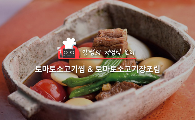 오늘 요리의 저염식 비법을 보면, 토마토소고기찜은 레드 샐러리, 파슬리 후추 등 향신료 특유의 맛과 향으로 짠맛을 대체하였습니다. 토마토소고기장조림은 사과의 단맛과 버터의 고소한 맛으로 소스를 만들어 추가로 간을 하지 않고 소고기의 풍미와 맛을 살렸습니다.