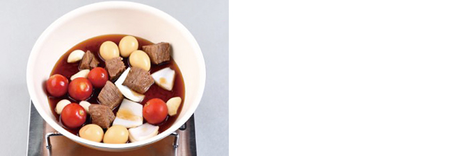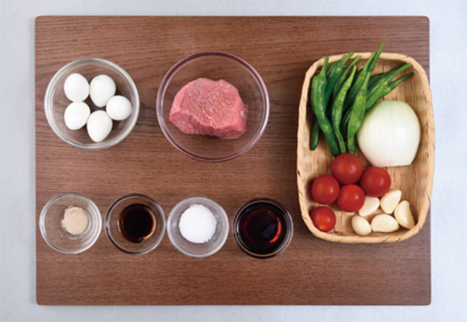 소고기 우둔살 200g, 메추리알 100g, 방울토마토 100g, 마늘 30g, 꽈리고추 50g, 양파 45g