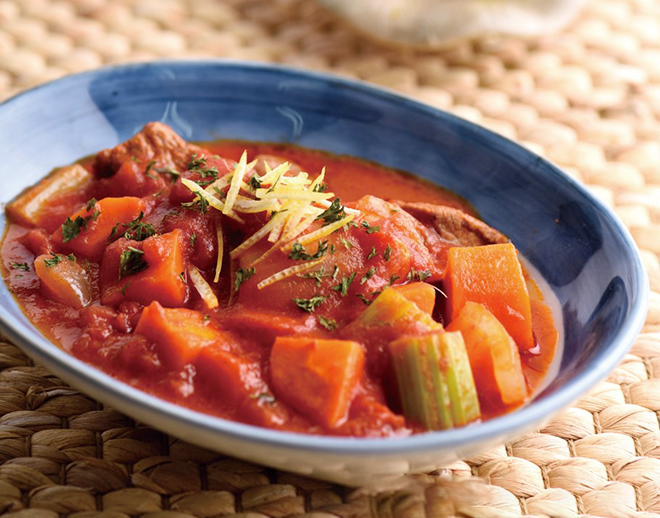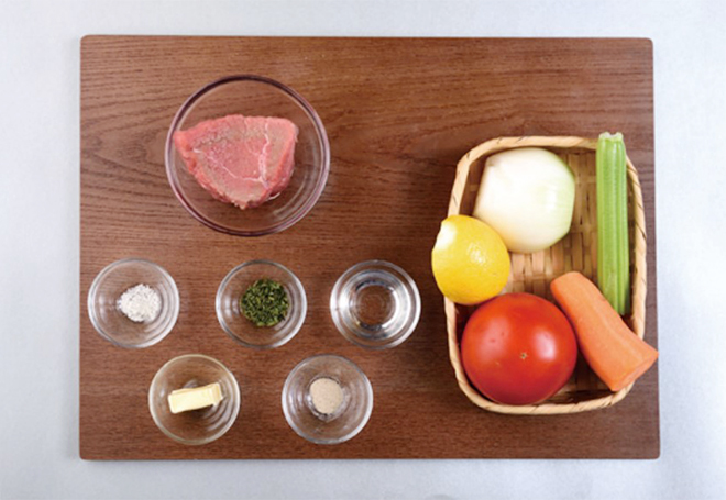 소고기우둔살 200g, 샐러리 40g, 당근 30g, 양파 50g, 화이트와인 25g, 홀토마토 100g, 버터 20g, 레몬 25g, 흰후추 1g, 파슬리가루 2g, 함초소금 1g
