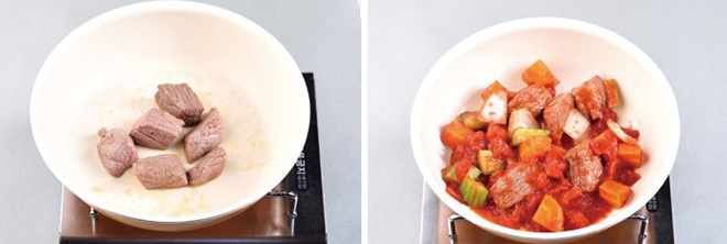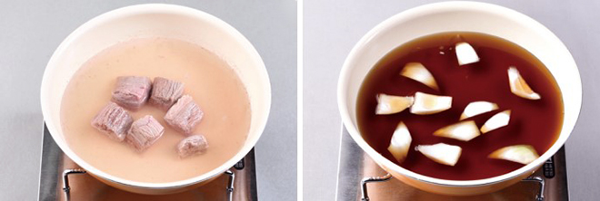 ① 소고기는 사방 2cm 정도 크기로 잘라 물에서 80% 정도까지 익힌 후 냉수에 깨끗하게 세척한다.