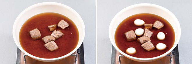 ③ 간장 물에 데쳐 놓은 소고기부터 졸이기 시작한다.