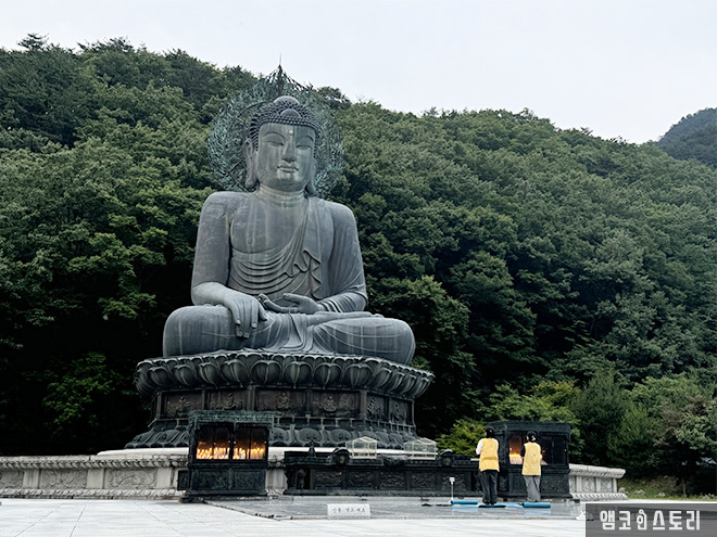 소공원에서 출발하여 신흥사 일주문을 지나면, 신흥사 통일 대불인 대형 석가모니를 만나게 되는데요, 민족 통일을 기원하기 위해 조성되었다고 합니다.