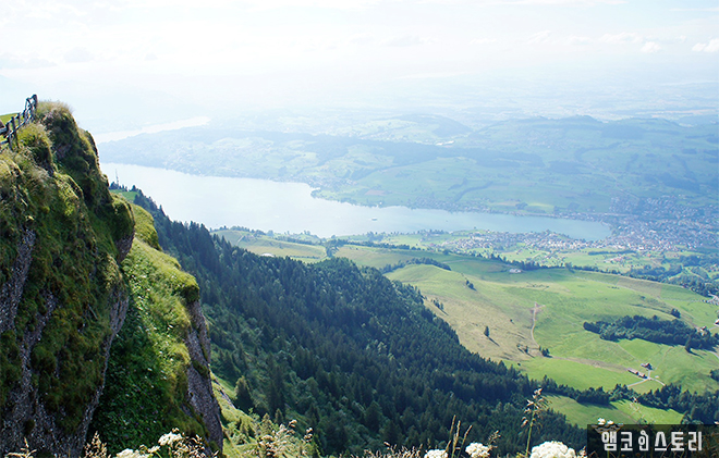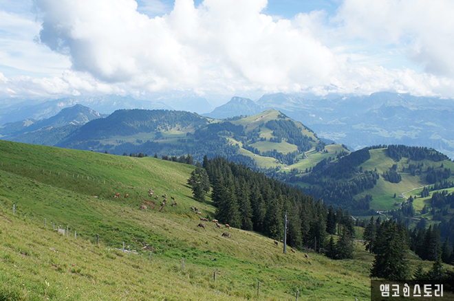 드디어 리기산 정상에 올라왔다. ‘산들의 여왕’이라는 리기산. 멀리 보이는 풍광이 구름에 가려 다소 아쉽다. 푸른 목초지에는 어김없이 소떼들이 한가로이 풀을 뜯고 있다.