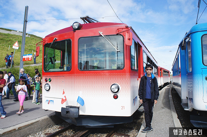 리기행 열차 앞에서 찰칵! 이 모든 탈 것이 스위스 패스가 있으면 OK다.