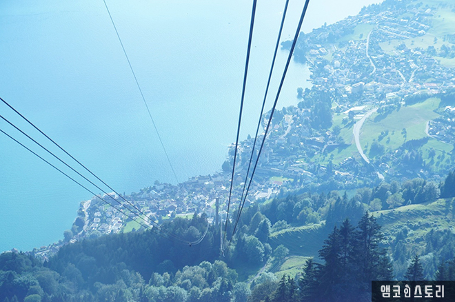 자, 케이블 카를 타고 베기스로 출발한다. 저 아래에 아름다운 루체른 호수가 보인다. 이렇게 어마 무시한 각도로 내려간다. 아래를 보면 다리가 후덜덜하다.