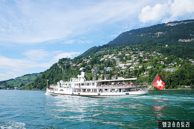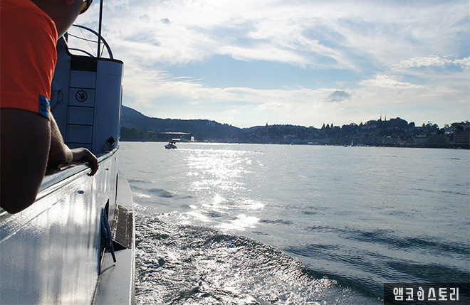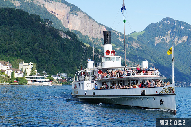 다른 유람선이 관광객들을 가득 싣고 우리 배 옆을 지나간다. 유람선 후미에서 펄럭이는 스위스 깃발이 멋지다.