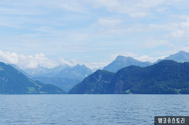 유람선이 출발하자 바깥 경치를 좀 더 가까이 즐기기 위해 갑판으로 올라가 본다. 세상에! 이렇게 멋진 호수 뷰라니! 멀리 보이는 눈 쌓인 산 봉우리들과 초록으로 둘러싸인 낮은 산들, 푸른 호수, 그리고 흰 구름이 한데 어울려 맑고 깨끗한 풍경을 만들어 낸다.