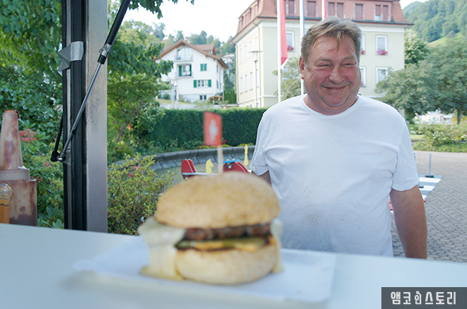 정말 멋진 경치가 아닐 수 없다. 루체른으로 가는 배를 기다리며 선착장 주위를 둘러보는데, 햄버거 가게가 있다. 햄버거에 꽂은 스위스 국기가 앙증맞다. 출출함을 달래기 위해 스위스 햄버거를 시켜본다. 마음씨 좋게 생긴 아저씨가 만들어 주는 맛있는 햄버거다. 냠냠~잘 먹겠습니다!