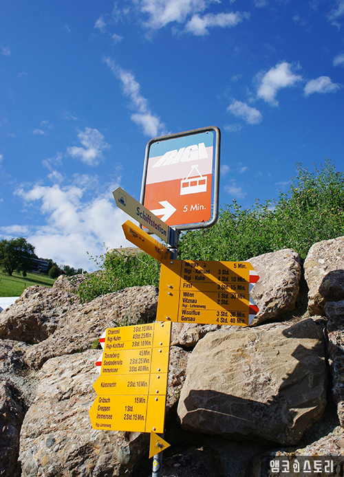 케이블카에서 내리면 베기스까지 10분 내리막을 걸어가야 한다. 아래 사진을 보면 알겠지만, 스위스어를 잘 모르더라도 된다. 배가 그려진 화살표가 있고, 그 아래 화살표에 Weggis 10 Min이라고 적혀 있다. 이 말인 즉, 베기스까지 걸어서 10분 걸린다는 얘기다.