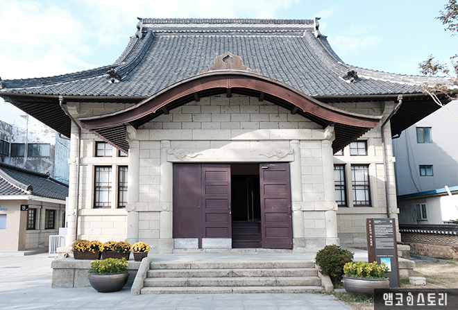 드디어 출발하는 버스! 처음으로 향한 곳은 <구 동본원사 목포별원>입니다. 목포 근대 유산 중 하나로 일본식 기와를 사용한 팔작지붕 등등, 전형적인 일본식 건축양식을 띄고 있는 건물은 일본 첫 불교사원으로 지어졌어요. 해방 이후 정광사의 관리를 받다가 목포 중앙교회에서 1957년부터 사용한 건물로, 절이 교회가 된 이색적인 약력을 가지고 있는 점도 특이해요. 현재는 오거리문화센터로 활용되고 있는데요, 목포 구도심의 심장과도 같은 목포오거리는 일제강점기 시절 조선인과 일본인 거주지역 접경지에 해당하여 꽤 번성하였다고 해요.