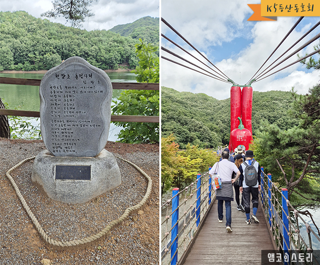 이중 우리는 천장호 코스를 선택했고, 산사랑 회원들은 인천 송도에서 출발해 칠갑산 아래에 있는 천장호 주차장에 도착했습니다. 산행을 위해 가벼운 맨손 체조를 함께 실시하고, 총 길이 207m인 우리나라에서 가장 긴 출렁다리를 건너는 것을 시작으로 해서 산행을 시작했습니다.