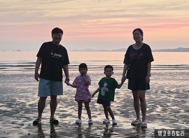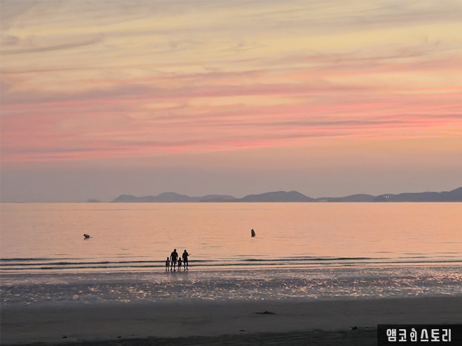 서해바다인 충남 태안 청포대 해수욕장 낙조가 아름답다. 하늘과 바다 지평선 위로 붉은 주황빛으로 물든 하늘. 한 폭의 그림 같은 일몰이 장관이다.