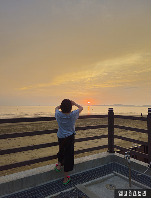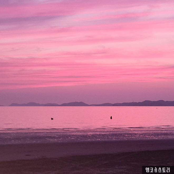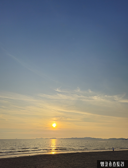서해바다인 충남 태안 청포대 해수욕장 낙조가 아름답다. 하늘과 바다 지평선 위로 붉은 주황빛으로 물든 하늘. 한 폭의 그림 같은 일몰이 장관이다.