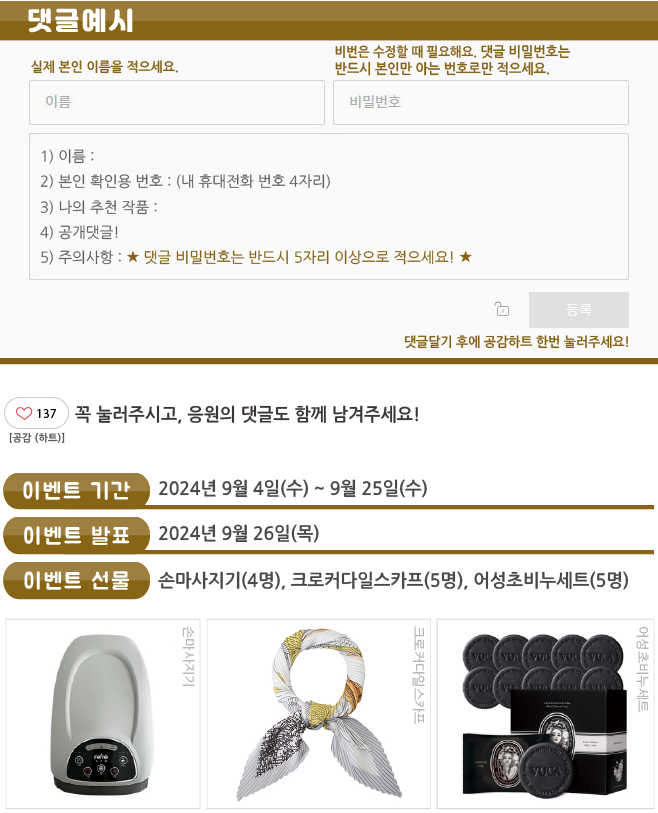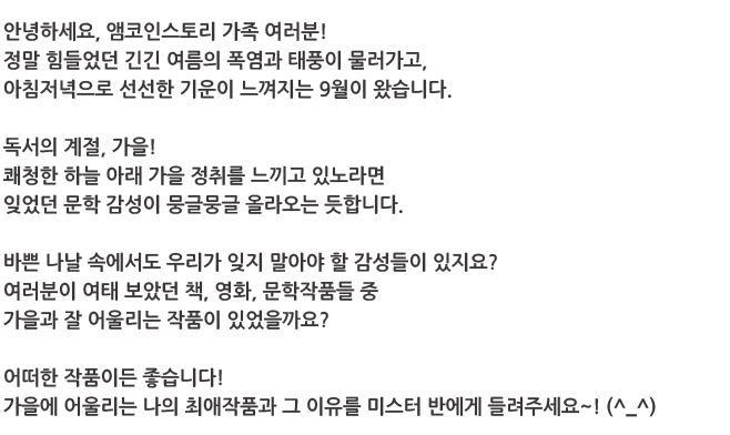| 가을맞이 최애작품 추천 이벤트 결과 발표_웹진 [앰코인스토리] (2) | 2024.09.26 |