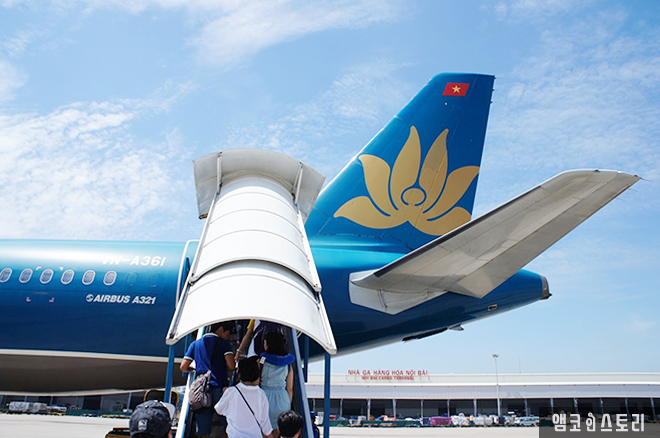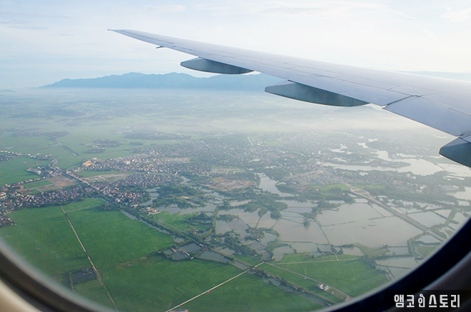 우리 가족을 태운 베트남 항공기는 순조롭게 운항을 하며 상공을 날고 있다. 창 아래로 보면 논이 끝없이 펼쳐지는데, 자세히 보니 물에 잠긴 논들이 많다. 아마 비가 많이 내려 홍수가 났었던 모양이다.