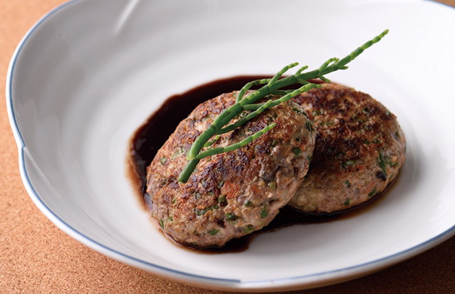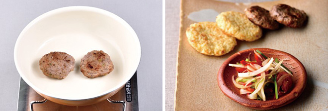 떡갈비 : 다진 소고기 50g, 다진 돼지고기 50g, 다진 양파 30g, 다진 쪽파 15g, 맛간장 10g, 후추 1g