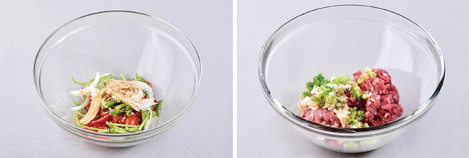 토마토겉절이 : 토마토 80g, 미나리 20g, 맛간장 5g, 청고추 15g, 홍고추 15g