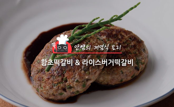 오늘 소개하는 라이스버거떡갈비는 떡갈비 재료로 패티를 만들고, 빵 대신 쌀을 사용했습니다. 저염 방법으로는 라이스버거와 떡갈비를 함께 먹을 수 있는 겉절이를 풍부한 토마토와 양파를 주재료로 하여 만들고, 일반 간장 대신 염도가 낮은 맛간장으로 맛을 냈습니다. 함초떡갈비는 소금 대신 자연식품인 함초를 사용해 함초 특유의 맛과 향미로 짠맛을 대체하였습니다.