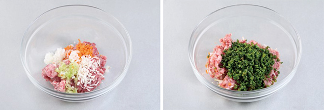 ③ 볼에 소고기, 돼지고기, 다져 놓은 채소와 다진 마늘, 다진 대파, 참기름을 넣고 반죽한다.