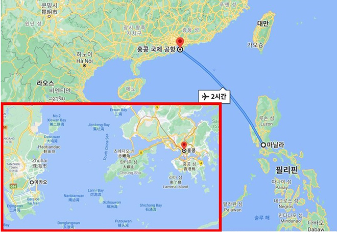 필리핀에서 마카오나 홍콩까지는 비행기로 약 두 시간 거리에 있고 마카오와 홍콩 사이는 배로 이동이 가능하니, 마카오로 입국해 홍콩에서 출국하면 한 번에 두 곳을 여행할 수 있다.