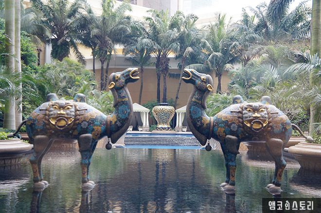 이제 남은 일정은 마카오타워, 스카이 워킹과 서커스 관람이다. 늦은 점심을 먹기 위해 윈호텔에 들렀다. 호텔 내부 정원을 멋지게 꾸며 놓았다.