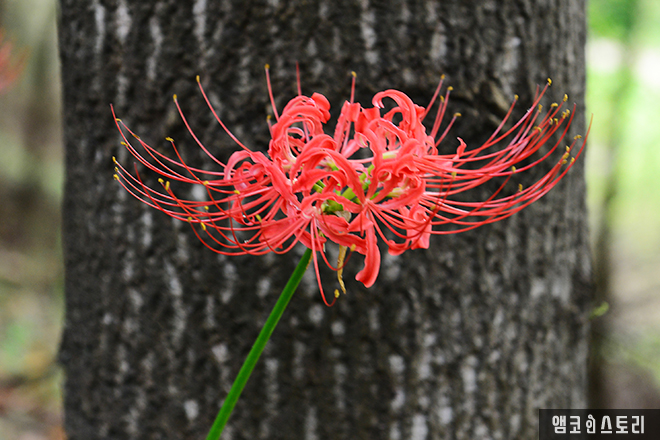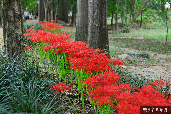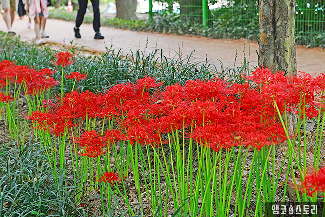 꽃무릇은 꽃이 먼저 핀 후에 잎이 나중에 돋아나기 때문에 ‘인간의 애절한 감정’이라는 꽃말을 담고 있다고 합니다. 그러나 산책길에 피어 있는 꽃무릇은 우리에게 강렬함과 열정을 피력하는 것 같습니다.