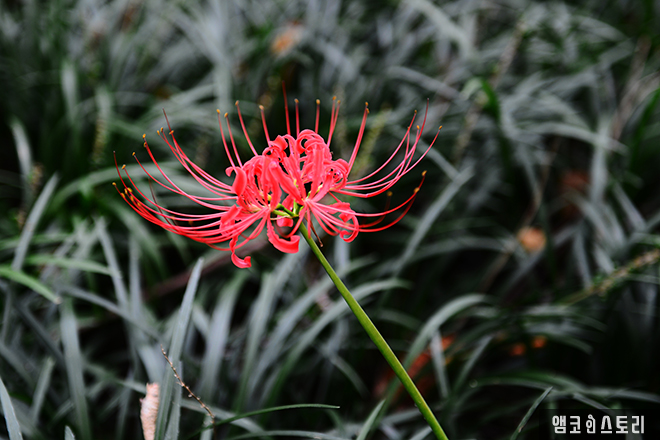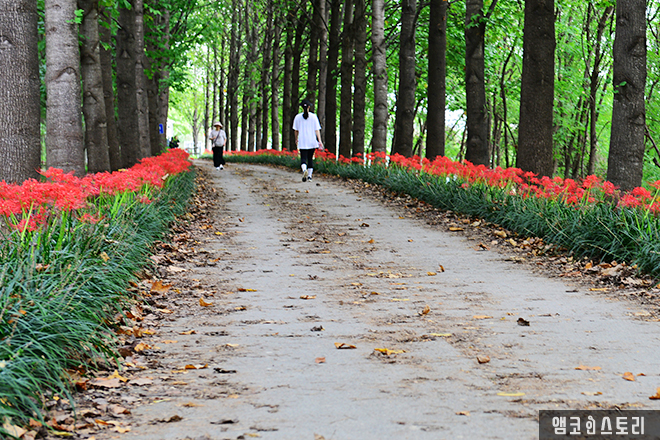 꽃무릇은 꽃이 먼저 핀 후에 잎이 나중에 돋아나기 때문에 ‘인간의 애절한 감정’이라는 꽃말을 담고 있다고 합니다. 그러나 산책길에 피어 있는 꽃무릇은 우리에게 강렬함과 열정을 피력하는 것 같습니다.