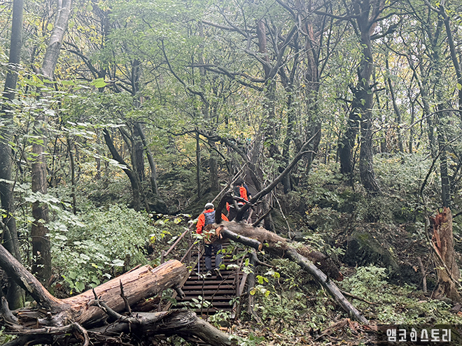 얼음골 공원 지킴터에서 정상까지 가는 길은 데크 계단이 정비되어 있기 때문에 난이도가 어려운 등산 코스는 아니었습니다. 하산하는 제비봉 탐방센터길이 돌이 많고 좀 더 가파른 느낌이라 반대로 올라오면 조금 더 힘들 수도 있겠다는 생각이 드는군요.