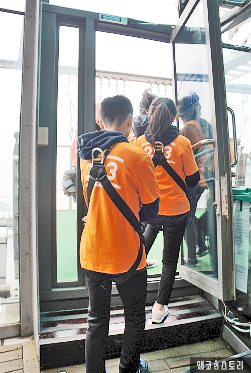 티켓을 받고 오렌지색 옷을 입고 오면 안전요원이 스카이워크용 멜빵을 입혀주고 점검해준다. 운동화 끈이 풀려 밟히지 않도록 다시 점검도 한다.