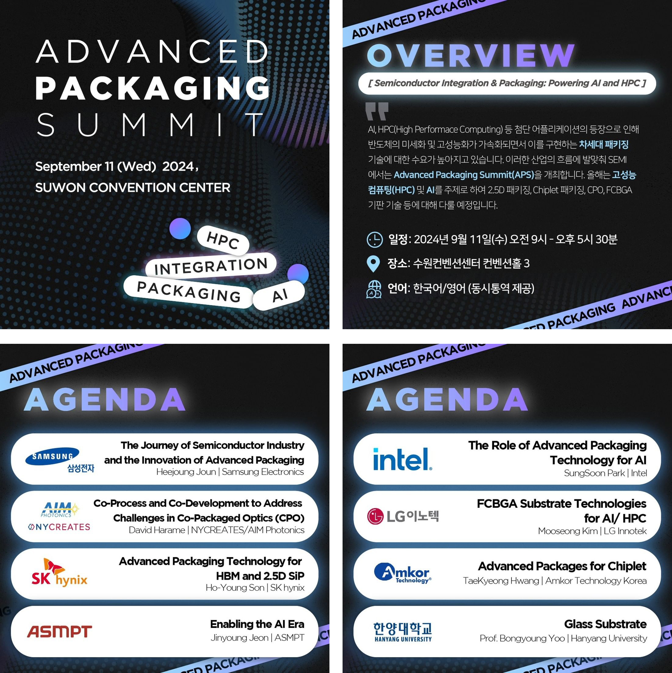 9월 11일, SEMI가 주최한 Advanced Packaging Summit 2024(APS 2024)이 수원컨벤션센터에서 개최되었습니다. 이번 행사는 Al, HPC(High Performace Computing) 등 첨단 어플리케이션의 등장으로 가속화된 반도체의 미세화 및 고성능화를 구현하기 위한 차세대 패키징 기술의 수요가 높아지고 있는 가운데, 이러한 산업 흐름에 맞춰 고성능 컴퓨팅(HPC) 및 AI를 주제로 2.5D 패키징, Chiplet 패키징, CPO, FCBGA 기판 기술 등에 대해 다루는 자리를 마련했습니다.