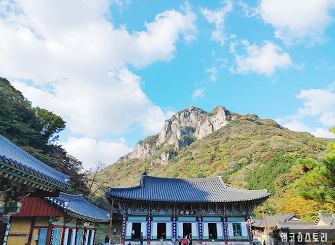 이상 기후의 영향으로 백양사의 단풍이 절정은 아니지만, 푸르른 하늘은 쌍계루 앞 연못에 비친 단풍과 함께 백학봉의 기암절벽이 어우러져 아름다운 풍경을 선사합니다.