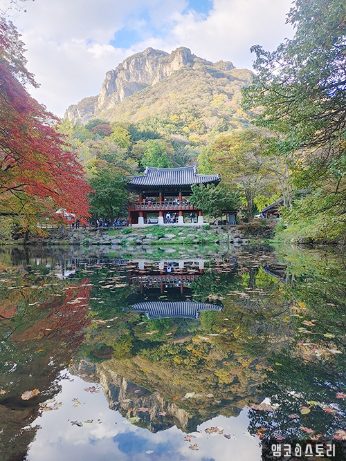 이상 기후의 영향으로 백양사의 단풍이 절정은 아니지만, 푸르른 하늘은 쌍계루 앞 연못에 비친 단풍과 함께 백학봉의 기암절벽이 어우러져 아름다운 풍경을 선사합니다.