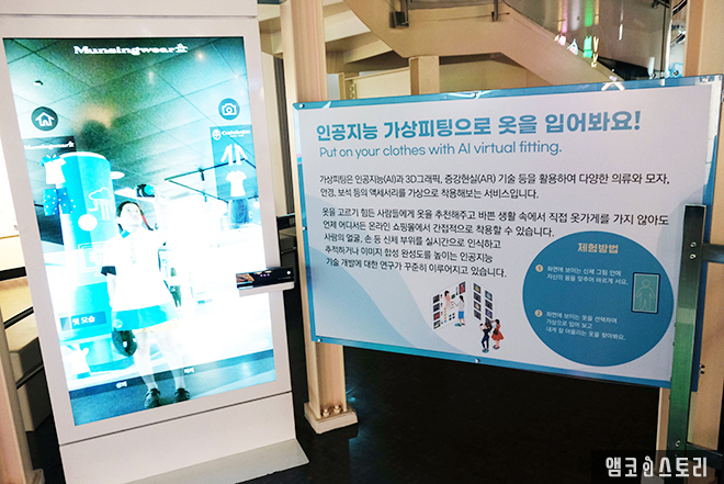 총 2개 층으로 구성된 전시로 1층에는 AI 타워를 포함해 과학과 예술을 접목한 체험 콘텐츠와 AI 연구성과를 살펴볼 수 있는 전시품들을 만날 수 있어요. 먼저 ‘인공지능 터널’은 카메라를 통해 인식한 체험객의 움직임 등의 데이터를 터널 속 화면의 이미지로 변환하여 표현한 전시품이에요. 과학과 예술을 접목한 체험 콘텐츠에서는 동작을 활용하여 자신만의 추상화 작품을 만들며 인공지능과 함께 춤을 추고 연주도 해요. 그 외 AI로 이야기도 만들고 가상 피팅 패션쇼, 인공지능으로 제작한 맞춤형 의상도 보여요.