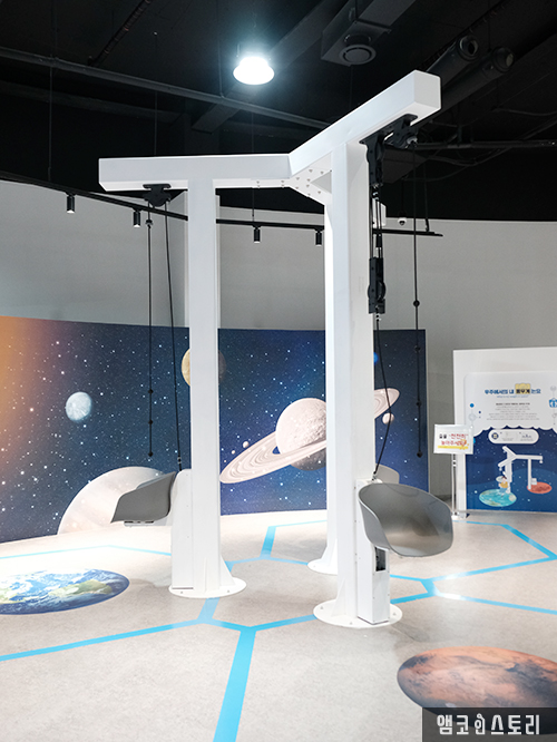 이곳에서 인기 만점은 로봇이에요. 로봇과 직접 가위바위보를 하며 로봇팔의 운동 원리를 관찰하는 전시물 앞에는 호기심과 승부욕 가득한 아이들로 빼곡해요. 로봇의 원리보다 승부의 세계가 더 흥미진진한 현장에서 지켜보는 어른들의 얼굴에는 미소가 가득합니다. 로봇과 함께 카툰스튜디오도 완성할 수 있어요. 드로잉 로봇이 그린 자신의 초상화에 색을 칠하고 스티커를 붙여봅니다. 전시는 이제 우주를 향해요. 고장 난 우주정거장을 3D프린터로 제작한 부품으로 고쳐보기도 하며 지구, 화성, 달에서 중력에 따른 무게변화를 도르레를 이용하여 체험도 해봐요. 꼬마 우주선은 탄성이 있는 바닥 공간에서의 점프 동작을 통해 지면에서 감각을 비교해 보는 신체발달 놀이형 체험이에요. 마지막으로 ‘2045 Odyssey’는 VR시뮬레이터 체험으로 ‘화성에서 살아남기'라는 미션을 수행하며 지구와 화성의 환경 차이에 대하여 알아봅니다.