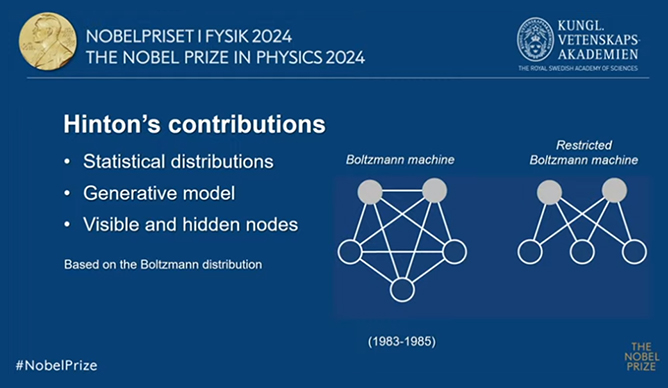 존 홉필드 교수와 제프리 힌턴 교수, 이 두 명의 학자가 성취한 수많은 업적 중에서도 이번 노벨물리학상 수상의 홉필드 네트워크(Hopfield network)와 제한된 볼츠만 머신(Restricted Boltzmann Machine, 이하 RBM)은 상당히 의미 있는 성과입니다. 노벨위원회는 이들의 연구가 현대 머신 러닝의 강력한 기반을 마련하였고, 특히 물리학의 도구를 사용하여 정보 내의 패턴을 찾는 방법을 개발함으로써 오늘날의 인공신경망과 딥러닝 기술의 발전에 크게 기여했다고 소개하였습니다.
