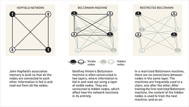 Hopfield network, (unrestricted) Boltzmann machine, restricted Boltzmann machine 간 도식적 비교 (사진출처 : Popular Information. The Nobel Prize in Physics 2024 https://www.nobelprize.org)