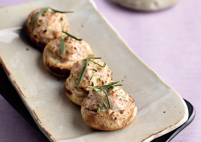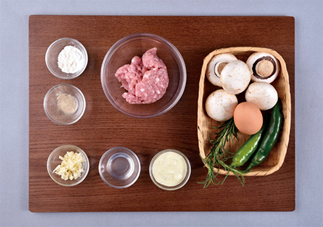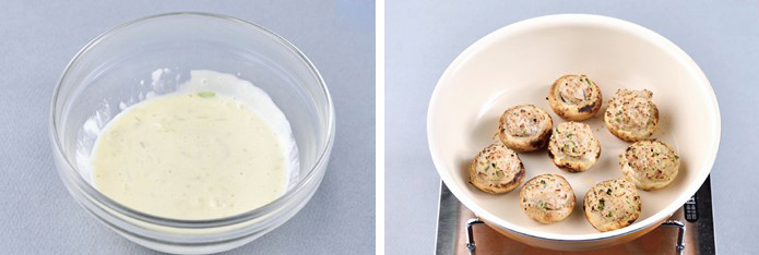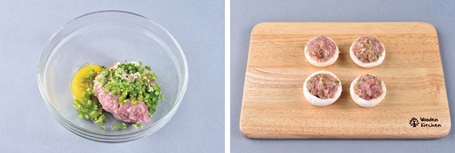 ④ 양송이 소에 양념된 돼지고기를 채운다.
