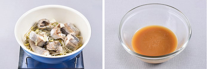 ⑤ 미나리와 콩나물은 손질한 후 찜기에 깔고 코다리를 찐다.