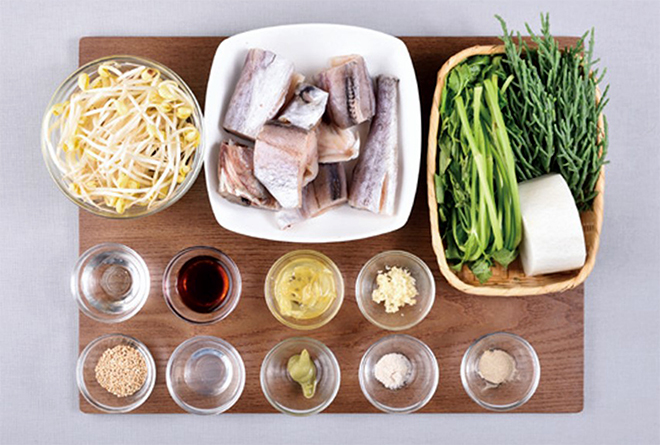 코다리 250g, 콩나물 50g, 미나리 20g, 함초 25g, 무 30g, 함초소금 1g