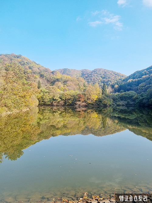 CNN이 선정한 한국의 명소로 선정된 화순 세량지. 이상 기후의 영향으로 단풍이 절정은 아니지만, 푸르른 하늘은 세량지 앞 연못에 비친 약간의 단풍과 함께 정상 부근에 있는 연리목이 가을을 맞이하여 아름다운 풍경을 선사합니다.