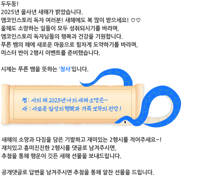 | 을사년 새해맞이 2행시 이벤트 결과 발표 _ 웹진 [앰코인스토리] (0) | 2025.01.24 |