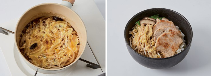 ⑥ 그릇에 밥을 담고, 돼지고기와 숙주를 올린 뒤 뜨거운 육수를 부어 마무리한다.