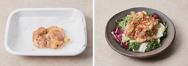 ⑥ 그릇에 손질한 채소를 깔고, 구운 닭다리살을 올린 뒤, 소스와 무순을 올려 마무리한다.