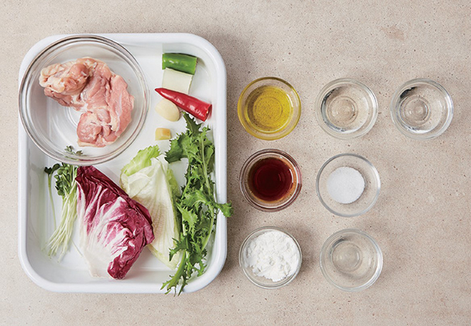 닭다리살(110g), 양상추(25g), 그린 치커리(5g), 라디치오(5g), 홍고추(5g), 청양고추(5g), 대파(5g), 무순(3g), 마늘(1g), 생강(1g), 식용유(3g)